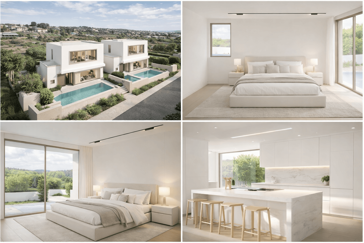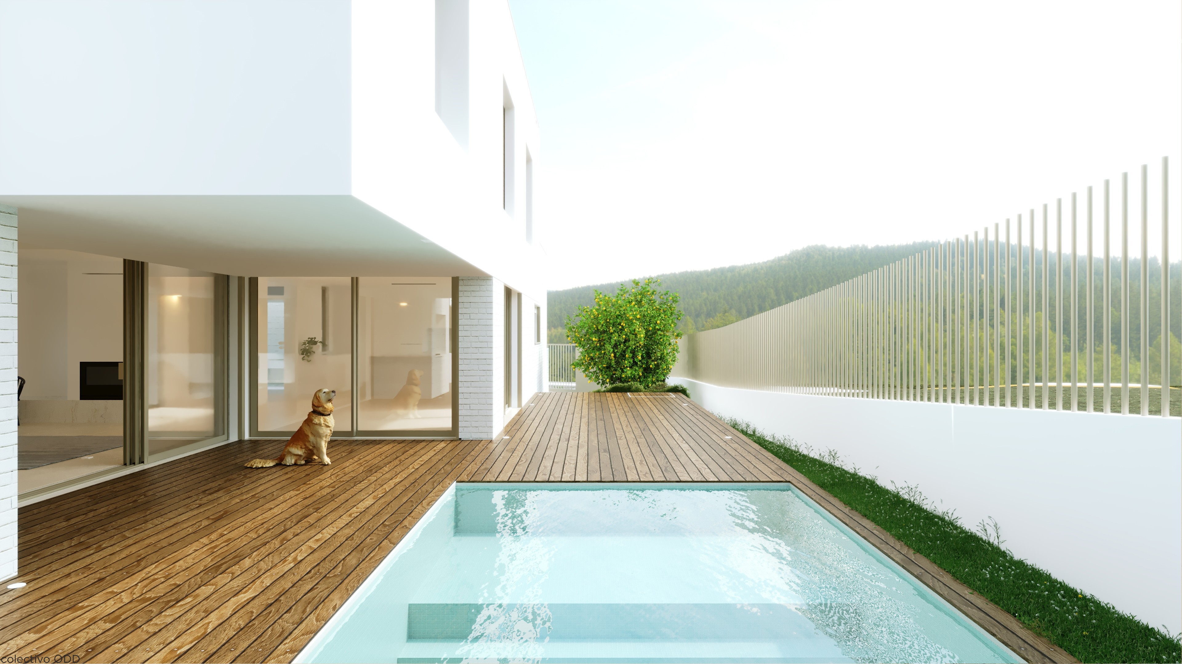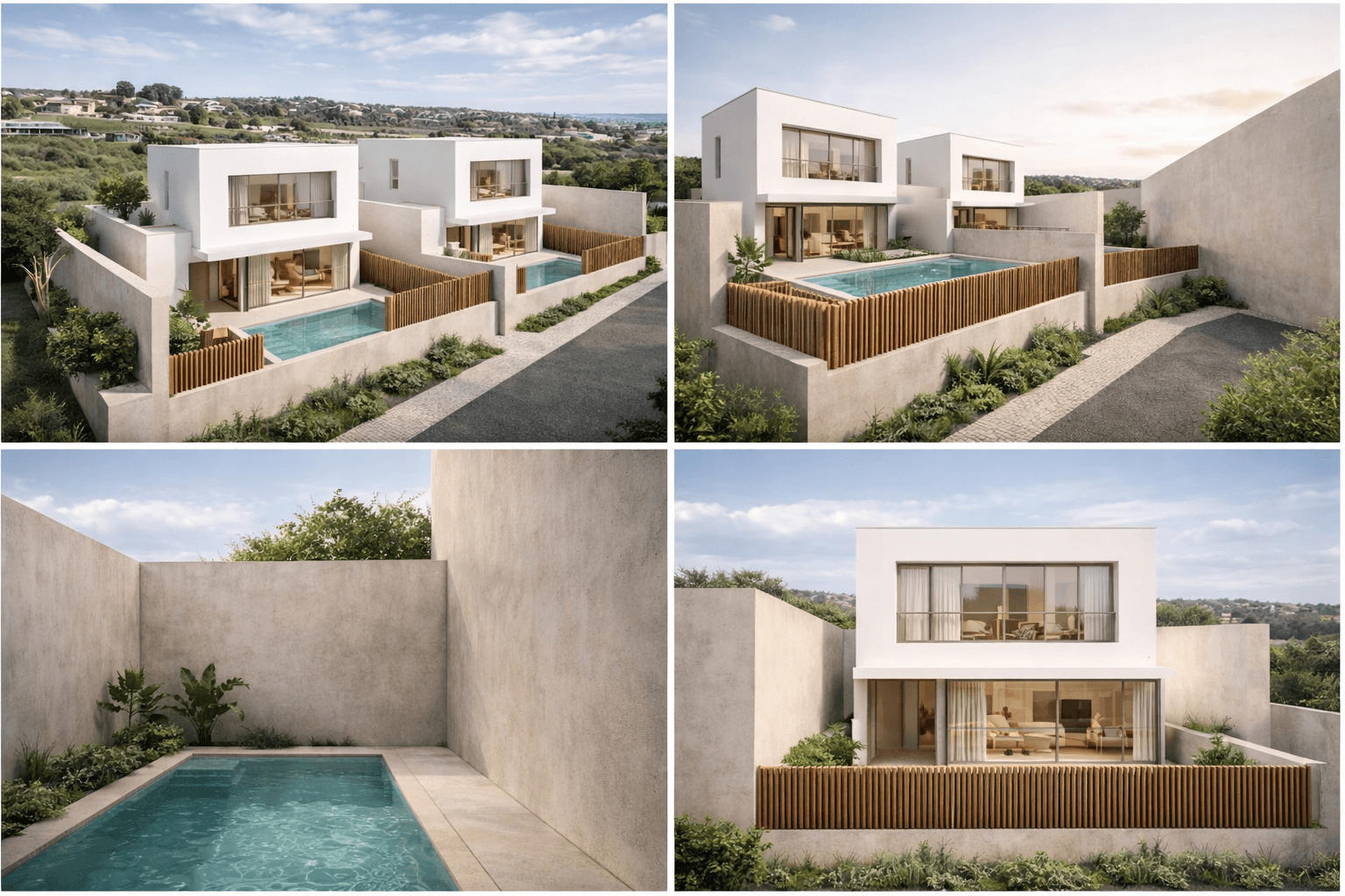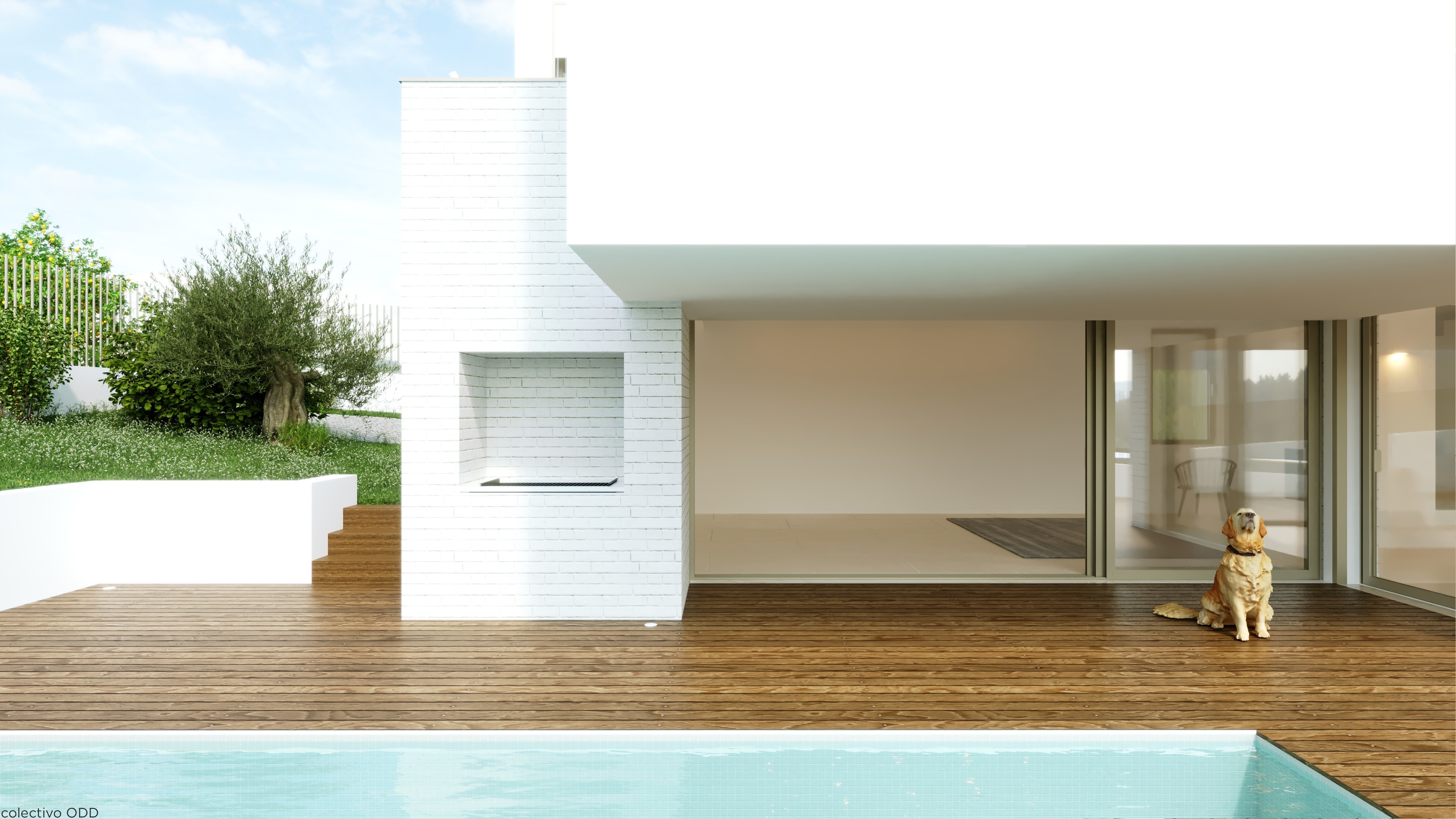 Cada moradia foi desenhada com rigor arquitetónico e elegância contemporânea. Volumes puros, amplas superfícies envidraçadas e interiores generosos criam uma ligação fluida entre os espaços interiores e os jardins privativos com piscina, proporcionando uma vivência exclusiva e intimista.